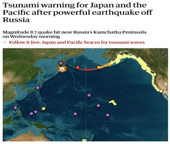 - 러시아 동부 오호츠크해에 접한 캄차카반도에 대규모 강진이 잇따라 발생해 근처 지역에 재난 가능성이 우려되고 있음. 유럽지중해지진센터(EMSC) 등에 따르면, 이날 오전 11 시 24 분께 캄차카반도 동쪽 바다에 규모 8.0 지진이 발생. 이어, 오후 12 시 16 분께에도 캄차카반도 동쪽 근해에서 규모 8.7 의 초강진이 재차 발생했음. 미국 태평양쓰나미경보센터(PTWC)는 첫 지진 이후, 러시아와 일본에 3 시간 이내에 위험한 쓰나미가 닥칠 수 있다고 경보를 발령