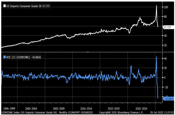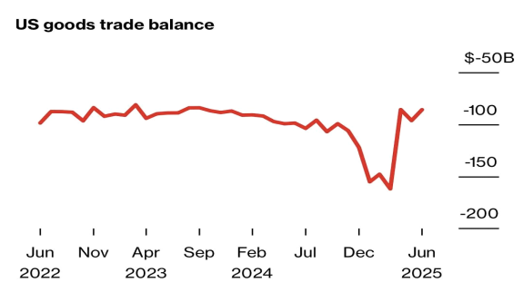 - 미국 6 월 상품 무역적자는 예상보다 큰 폭으로 감소. 관세 부과 전 상품 확보 경쟁이 완화되면서 수입이 전반적으로 감소했기 때문 - 상품 무역적자는 전월 대비 10.8% 감소한 860 억 달러. 수입은 4.2% 감소, 수출은 0.6% 감소