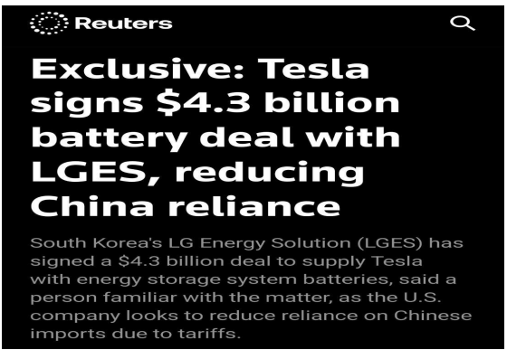 :LG 에너지솔루션, 6 조 규모 테슬라향 LFP 배터리 수주 계약 체결 공시. 삼성 SDI 도 테슬라 기대감 반영