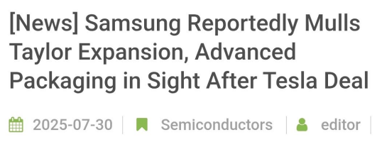 # 삼성전자, 테슬라와 계약 후 미국 텍사스주 테일러 팹 확장, 첨단 패키징 추가 투자 검토 중