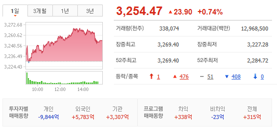 - 코스피는 +2.74pt 상승한 3,233.31pt 로 출발. 외국인 코스피 200, 선물 매수, 기관 현선물 매도 출발. 석유 에너지/LPG, 조선/조선기자재, 정유, 증권, 퓨리오사 AI, 인터넷, 시멘트/레미콘, 도시가스, AI 챗봇, STO, 은행, 리튬 등 상승 출발