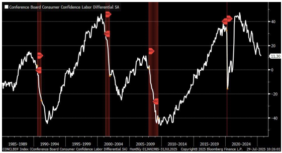 # 다만, 7 월 일자리 풍족/부족 응답 지수가 11.3 까지 하락하면서 “New Low Cycle”을 만들었음. 고용시장에 대한 의구심이 커진 상황