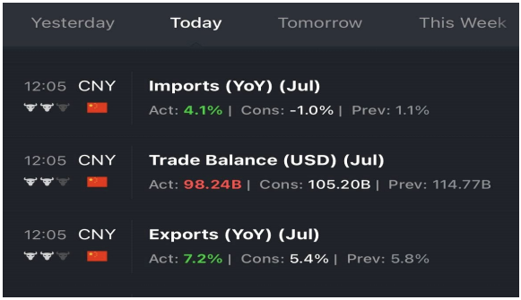 - 정오 무렵 중국 수출입지표가 발표되며 코스피 상승에 가세. 7 월 수출은 YoY +7.2% , 수입은 YoY +4.1%로 모두 시장 예상치(수출 +5.0%, 수입 +3.0%)를 상회