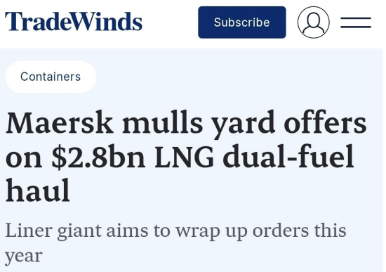 # 머스크(Maersk), 25~28 억달러 규모의 LNG DF 컨테이너선 12 척 신조 발주 준비 중