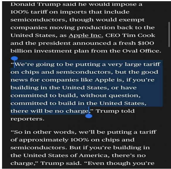 - 한편, 트럼프 美 대통령은 6 일(현지시간) 반도체에 약 100%의 품목별 관세를 부과할 것이라고 밝힘. 트럼프 대통령은 백악관에서 열린 애플의 대미 시설투자 계획 발표 행사에서 "우리는 반도체에 약 100%의 관세를 부과할 것"이라며, "미국으로 들어오는 모든 집적회로(chips)와 반도체(semiconductors)"가 부과 대상이라고 밝힘. 이어, "만약 미국에 (반도체 제조 공장을) 건설한다면 부과되지 않을 것"이라고 언급