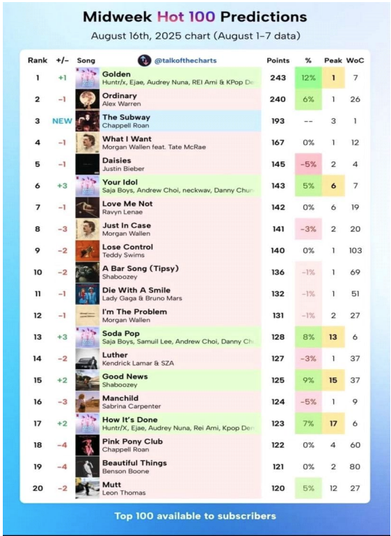 # 다음주 빌보드 Hot100 예측...데몬 헌터스가 받쳐주는 K 컬처