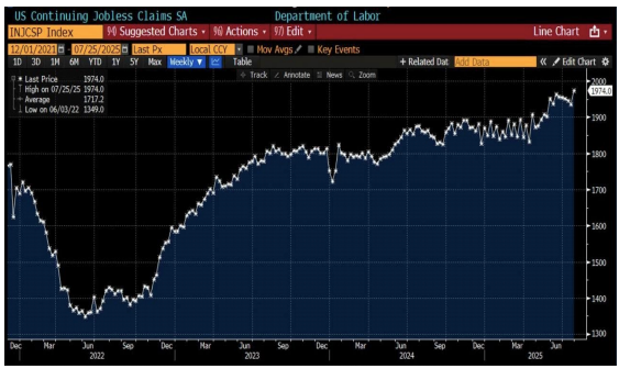 # 연속실업수당 청구건수는 1974k 로, 2021 년 11 월 이후 최고치 기록