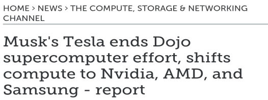 - Tesla 가 Dojo 슈퍼컴퓨터 팀을 해체하고 Nvidia, AMD, Samsung 칩 사용으로 전환한다.