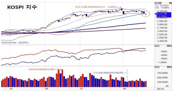 - 전망: 당분간 특별한 악재가 발생하지 않더라도, 다수의 불확실한 이벤트를 앞두고 차익 실현 매물이 출회할 가능성이 존재. 잭슨홀 미팅(8 월 21 일 밤)뿐 아니라, 8 월 25 일 의회 본회의에서 2 차 상법개정안 등 주요 법안이 논의될 수 있으며, 정부의 대주주 양도세도 8 월 내 발표가 예상됨. 또한, 8 월 23 일 한일 정상회담, 8 월 25 일 한미 정상회담 등 외교 이벤트 역시 시장 참여자들의 관망 심리를 강화시키는 요인