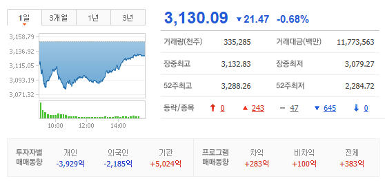 - 코스피는 -30.04pt 하락한 3,121.52pt 로 출발. 외국인 현선물 매도, 기관 코스피 200, 선물 매수 출발. 전일에 이어 원전 관련주 하락 출발한 가운데, 냉동김밥, 백화점, 자전거, 자동차/타이어, 카지노, NCC 화학, 일부 화장품 등 상승 출발