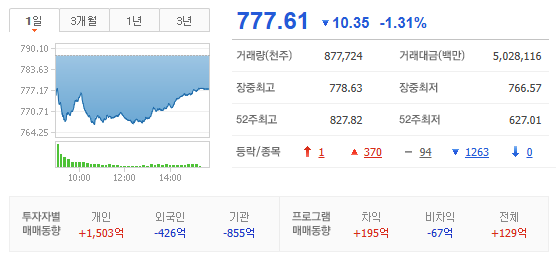 :기관 순매수-개인 순매도 하는 가운데, 3 거래일 연속 순매도하며 지수 하락 야기한 외국인 여전히 순매도