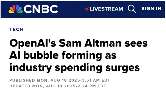 - 외신에 따르면, 샘알트먼 오픈 AI CEO 가 기자 간담회에서 인공지능(AI) 산업에 거품이 끼었을 수 있다고 인정한 것으로 전해짐. 알트먼 CEO 는 "투자자들이 인공지능에 과도하게 흥분해 있는 것은 사실"이라며, "인공지능 기업들의 가치가 이미 통제 불능 수준"이라고 밝힘