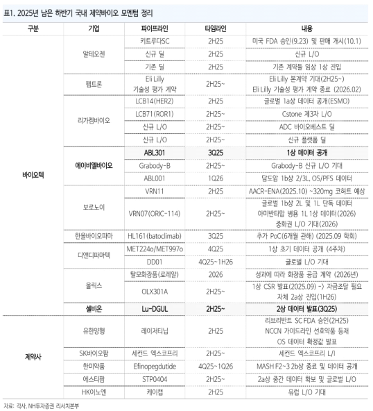 - 아울러, 이번주부터 국내 바이오텍(에이비엘바이오, 셀비온 등)의 주요 데이터 발표가 예정되어 있다며, 특히, 에이비엘바이오는 핵심인 그랩바디 B 플랫폼 첫 임상 데이터로 결과에 따라 추가 딜 기대감 확대까지 확장이 가능하다고 밝힘. 데이터 발표 외에도, 리가켐바이오, 알테오젠, 펩트론 등 대형 바이오텍이 연내 추가 L/O 가능성을 소통중인 점도 긍정적이라고 밝힘