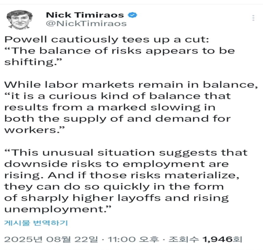 * 파월 의장이 금리 인하 가능성을 조심스럽게 시사했습니다: > “리스크의 균형이 이동하고 있는 것으로 보인다.”