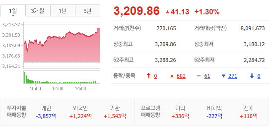 - 코스피는 +26.41pt 상승한 3,195.14pt 로 출발. 외국인 및 기관 현물 매도, 선물 매수 출발. 대부분의 업종 상승 출발한 가운데, 원전, 퓨리오사 AI, 희토류, 조선기자재, 스마트그리드, 로봇, 전력설비, PCB, ESS, 비만치료제, 건설, 리튬, 증권, 제약바이오, 통신장비 등 상승 출발