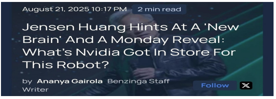 # NVIDIA CEO 젠슨 황이 “로봇에게 새 뇌를 선물”이라는 메시지와 함께 8 월 25 일(월)에 특별 발표를 예고, 로봇 관련 신기술을 발표할 예정