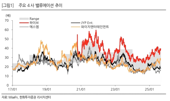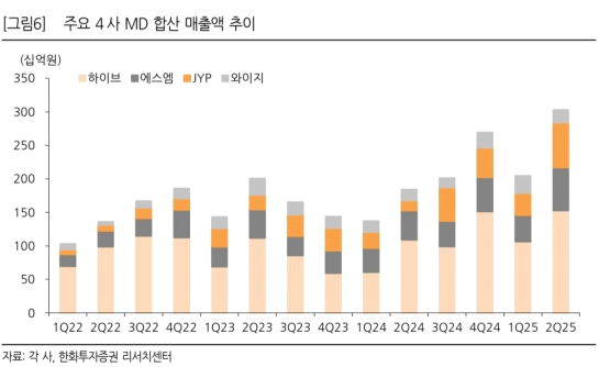 - 다만, 4 사 공통적으로 나타나고 있는 MD 실적 서프라이즈를 간과할 수 없음. ’22-‘23 에 나타났던 앨범 사이클보다 더 길고 강한 사이클이 예상되는 상황. 최근의 케데헌 열풍으로 인한 밸류에이션 상승도 무시할 수 없음