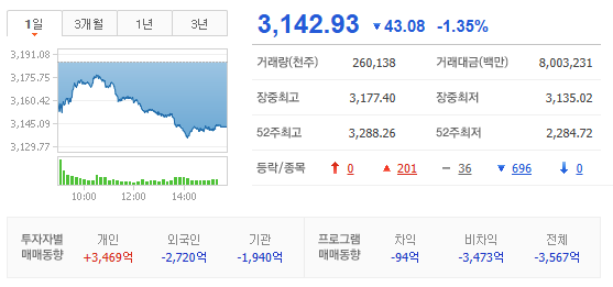 :업종별로 조선, 자동차, 보험, 음식료 업종 상승. 반도체, 화학, 금융지주 업종 하락