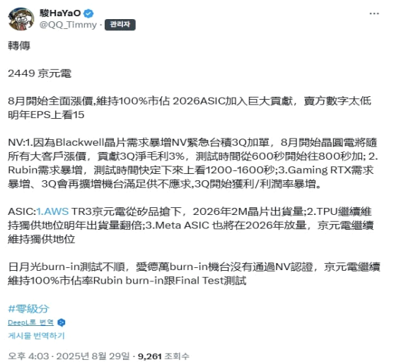 1) Blackwell 칩 수요 폭증 엔비디아가 TSMC 에 3 분기 긴급 추가 발주. 8 월부터 징위안전이 모든 주요 고객과 함께 테스트 가격 인상. 이로 인해 3 분기 순이익률 +3%P 개선 예상. Blackwell 칩 테스트 시간: 600 초 → 800 초로 증가.