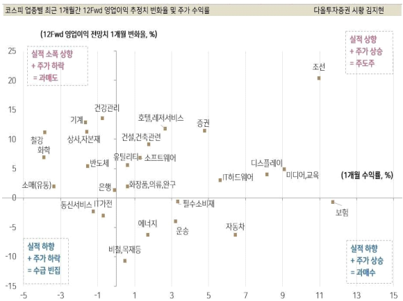 # (by 다올투자증권) 코스피 업종별 최근 1 개월간 12Fwd 영업이익 추정치 변화율 및 주가 수익률