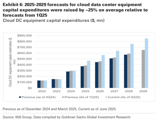 # (by 골드만삭스) 25 년부터 29 년까지 AI 클라우드 DC CAPEX 전망치를 대폭 상향조정(이전 전망치 대비 연평균 25%씩 상향조정)