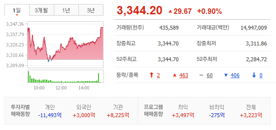 - KOSPI 는 장초 3,344p 까지 도달하며 신고가 재차 경신. 대통령 기자회견 확인 후 셀온 매물 출회에 강보합
