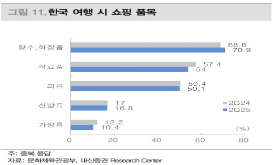 - 특히, K-뷰티의 글로벌 침투율 확대에 맞춰 화장품은 여전히 방한 외국인이 구매하는 대표 품목이라고 밝힘. 과거 단체관광 중심의 방한 관광객은 면세점 중심으로 화장품 소비가 이뤄졌으나, 최근에는 20~30 대 여성 자유 관광객이 증가하며 올리브영, 다이소, 개별 브랜드의 플래그십 매장 등으로 화장품 수요가 이동하고 있다고 밝힘. 한국에서 구매한 K 뷰티 제품은 귀국 후에도 온라인 역직구몰이나 현지 유통망을 통해 반복적으로 구매될 가능성이 높으며, 이러한 해외 현지에서의 재구매로 이어지는 선순환 구조는 중장기적으로 한국 화장품 수요를 뒷받침 할 것으로 전망