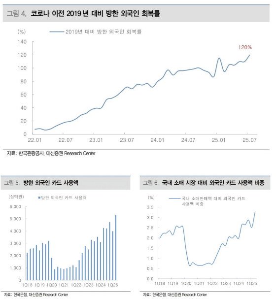 - 대신증권은 보고서를 통해, 전세계적으로 불어닥친 케데헌(Kpop Demon Hunters) 열풍 등 K-컬쳐 영향으로 올해 입국하는 외국인은 최초로 2,000 만명에 달하며, 2019 년 최고치를 넘어설 것으로 전망. 우리보다 외국인 방문객 회복이 앞서 나타났던 일본의 경우, 외국인 방문객수가 증가하면서 일본의 내수 소매시장 성장률은 GDP 성장률을 상회했으며, 일본의 주요 유통사 주가가 크게 상승했다고 밝힘. 이들 기업의 외국인 매출 비중은 코로나 이전인 2019 년에 약 5-7% 내외였다가, 2024 년 12-15%까지 상승한 가운데, 한국도 현재 백화점의 외국인 매출 비중이 5-6%인데, 중장기적으로 10% 이상을 넘어설 가능성이 커지고 있다고 밝힘
