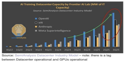 # (by 루팡) SemiAnalysis) 프론티어 AI 연구소(Frontier AI Lab)들의 AI 훈련용 데이터센터 용량(MW of IT Capacity) 증가 추이