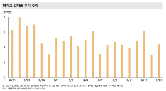 - 현재까지의 뱀피르 일평균 매출액은 20 억원 중반 이상으로 추정하고 있습니다. 3 분기 일평균 매출액 가정치를 15 억원, 4 분기 7 억원으로 상향했습니다만, 현재의 페이스는 이를 뛰어넘고 있습니다. 3 분기 뱀피르에 대한 시장 컨센서스는 10 억원 수준이었습니다.