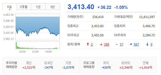 - 코스피는 -15.79pt 하락한 3,433.83pt 로 출발. 외국인 현선물 매도, 기관 현물 매도, 선물 매수 출발. LPG, 피팅/밸브, 조선/조선기자재, 해운, 도시가스, 제약바이오, 엔터/음원/음반, 정유, 통신, 자동차, 태양광 등 상승 출발