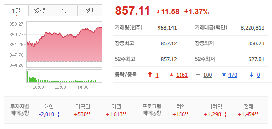 :외인 오전 코스피 순매도에서 순매수 전환. 기관(금융투자) 순매수