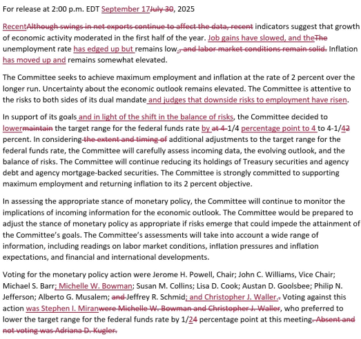 1 "노동시장 여건이 견고하기 유지됐다"(labor market conditions remain solid) 문구를 삭제하고 "노동시장 여건이 둔화됐다"(labor market conditions have slowed)로 변경