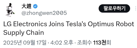 - 언론에 따르면, 사회관계망서비스(SNS) 엑스(X·옛 트위터)를 중심으로 LG 전자가 테슬라의 옵티머스 로봇 공급망에 합류했다는 소식이 전해짐. 엑스에서는 테슬라 장기 투자자임을 밝힌 한 사용자가 이 같은 게시글을 올렸으며, 해당 게시글은 조회수가 11 만회를 넘어서며 주목을 받았다고 알려짐. 다만, 이와 관련해 사실관계는 확인되지 않았다고 전해짐