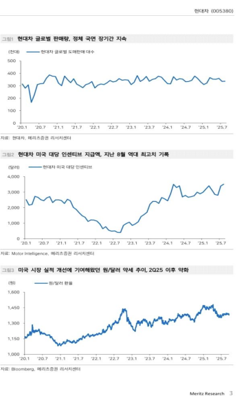 - 2021년부터 이어져온 원/달러 환율 YoY약세 수혜 강도 약해지고 있음 (2021년 원/달러 평균 환율 1,144 원-> 2022 년 1,291 원-> 2023 년 1,307 원-> 2024 년 1,357 원-> 2025 년 현재 환율 1,387 원). 판매량 성장률 정체 (2025 년 YTD 도매판매 +0.2% YoY/ 출고판매 -0.2% YoY). 지난 8 월 미국 시장 인센티브는 역대 최고치 기록 ($3,505, +6.4% YoY, +3.3% MoM). 그리고 25% 관세가 아직 부과 중