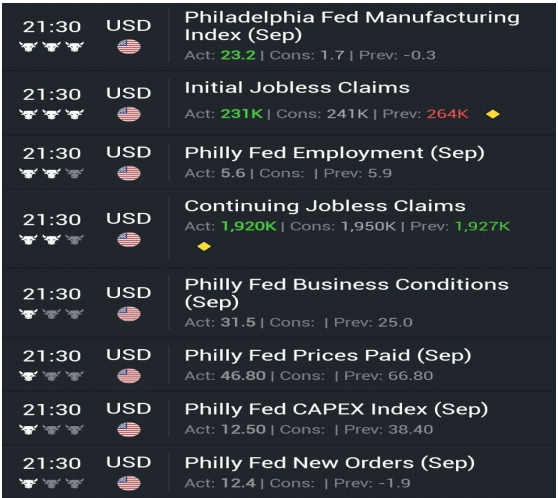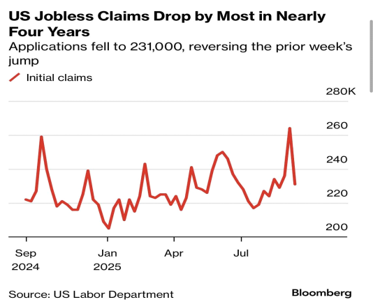:9/13 주로 끝나는 신규 실업수당 청구건수는 231k 로 예상치 241k 를 하회함과 동시에, 거의 4 년 만에 가장 큰 폭으로 감소