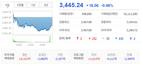 - 최근 신고가 행진을 이어오던 코스피는 숨고르기에 돌입. 장 초반에는 미국증시의 사상 최고치를 경신한 상승과 기술주 강세를 반영. 상승 출발하면서 3,467pt 로 장중 사상 최고치를 다시 한 번 경신하였으나, 차익실현 매물과 함께 하락전환. 코스피는 지난주부터 11 거래일 연속 상승, 6 거래일간 사상 최고치를 경신한 바 있으며, 연이은 상승에 따른 피로감과 차익실현 압력이 증가한 상황