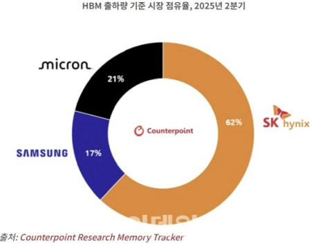 # 시장조사업체 카운터포인트리서치는 올해 2 분기 HBM 시장 점유율이 출하량 기준 SK 하이닉스 62%, 마이크론 21%, 삼성전자 17% 순으로 나타났다고 밝혔습니다.