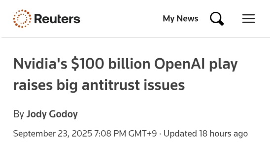 # NVIDIA 의 OpenAI 투자가 반독점 법을 위반할 수 있다는 가능성 제기. NVIDIA 가 AI 기반 칩 시장의 점유율 절반 이상을 확보하고 있기 때문