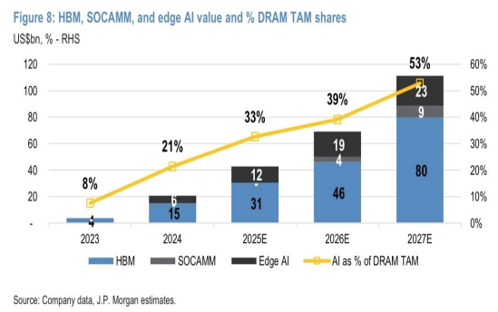 • 2023 년 AI DRAM TAM 은 사실상 100% HBM. 2025 년엔 전체 DRAM 의 33% → 2027 년엔 53%까지 확대