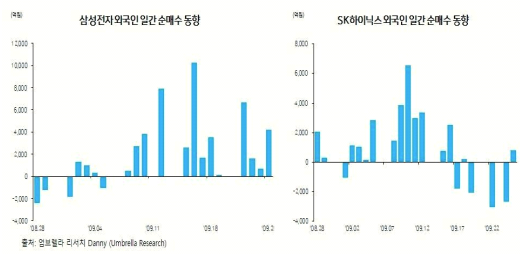 # (by 엄브렐라 리서치) 삼성전자+SK 하이닉스 외국인 일간 순매수 추이