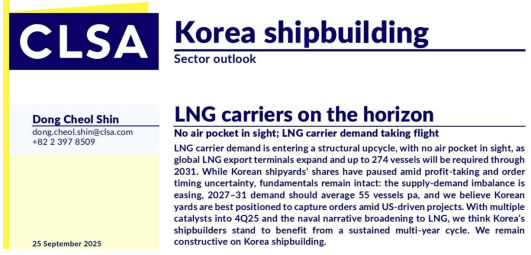 4Q25~2027 수주 사이클 첫 물량(미국발) → 한국 조선 슬롯 프리미엄 유지 가능성. 보수 가정(274 척)만으로도 업황 상단 근접한 가동률 전망 → 가격/마진 방어력↑.