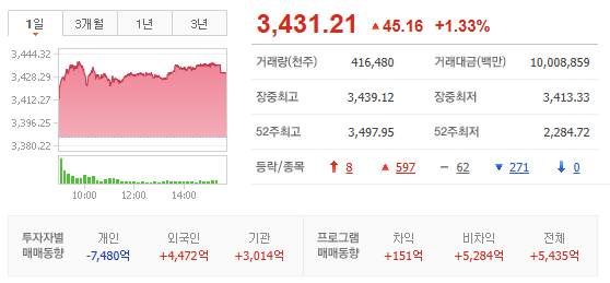- 코스피는 +28.38pt 상승한 3,414.43pt 로 출발. 외국인 현선물 매수, 기관 현물 매수, 선물 매도 출발. 네이버 위주 인터넷 관련주 상승 출발한 가운데, 보안, 두나무, STO, 블록체인, 가상화폐, 애플페이, 전자결제, 비만치료제, 액침냉각, 퓨리오사 AI, 로봇, 창투사, 증권, 면세점/화장품, 배터리 열폭주, 정유, IT 대표주, 스마트팩토리, 웹툰, 반도체/소부장, 유리기판, 제약바이오, 증권/은행/보험 등 상승 출발