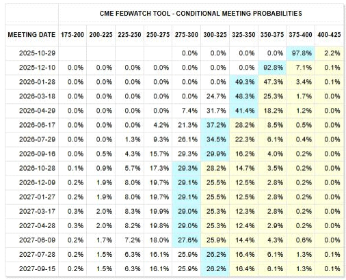 :10 월, 12 월 기준금리 인하 기대감이 97.8%, 92.8%로 높게 반영. 3 월로 예상됐던 2026 년 기준금리 인하 시기가 1 월로 앞당겨지는 양상. 2026 년 1 월 추가 25bp 인하 확률은 49.3% 확대(FedWatch)