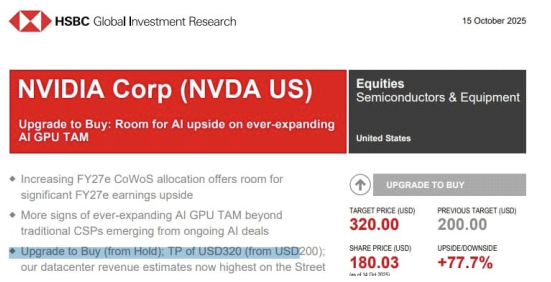 # (by HSBC) 투자의견 상향: Hold → Buy, 목표가 200 → 320 달러(+78%). 10/14 종가 180.03 달러 대비 업사이드 +77.7%
