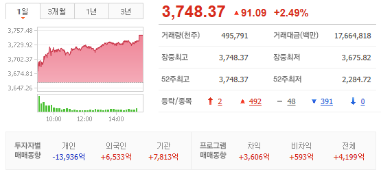 2. 코스피지수 사상 최초 3,700 선 돌파 소식 등에 증권 상승