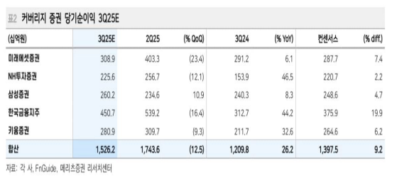 - 전일 메리츠증권은 보고서를 통해 커버리지 합산 증권사들의 3Q25 순이익 1.53 조원(-12.5% QoQ, +26.2% YoY)으로 컨센서스를 9.2% 상회할 것으로 전망. 우호적인 증시 환경 기반 브로커리지 및 IB 수익 양호한 흐름세가 지속되었다며, 브로커리지 수수료 수익은 전년동기대비 30.0% 증가를, IB 부문 관련 수수료 수익(인수/주선 및 기타 수수료 합산)은 전년동기대비 25.1% 증가를, 순상품운용손익 및 기타 손익은 전년동기대비 26.4% 증가를 추정한다고 밝힘. 이어 우호적인 영업환경은 지속되고 있고, 자본시장 선진화, 기업금융 경쟁력 제고방안 등 추가 성장 동력 확보에 따른 이익 확대 기대감 또한 유효하며, 해당 성장동력을 보유한 증권사 중심으로 적극적인 주주환원정책을 기대하기 충분하다고 설명