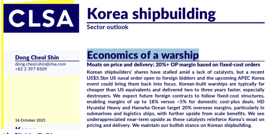 # (by 서화백의 그림놀이) Economics of a warship (CLSA Korea shipbuilding Sector outlook, 16 Oct 2025)
