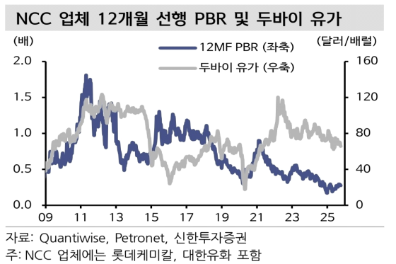 - 하나증권은 보고서를 통해 NCC 업체의 전반적인 영업환경 개선이 나타나고 있다며, 유가는 안정화 단계에 접어들었고, 업황 부진에 따른 가동률 조정과 구조조정이 구체화되고 있다고 밝힘. 유가/물가 안정화에 따른 금리인하도 수요 개선에 긍정적인 포인트라고 언급. 특히, 2026 년 미국 LNG 수출 확대에 따른 미국 천연가스 강세 가능성, 러시아/이란 원유 도입에 따른 중국/인도 제재도 상대적인 경쟁력 회복 관점에서 긍정적이라고 밝힘. 또한, 저가 원료가 투입되면서 NCC 업체의 실적 개선이 나타나고 있다며, 감가상각비가 낮고 가동률이 높은 대한유화의 2 년 만의 흑자전환은 의미가 있다고 언급