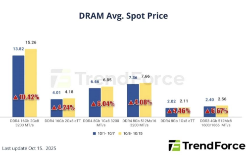 :DDR5 제품 가격도 동시에 상승세를 보이고 있다. 시장 전반은 ‘팔기를 꺼리는 분위기’로 특징지어지며, 주요 칩(DDR4 1Gx8 3200MT/s)의 평균 현물가격은 지난주 6.584 달러에서 7.059 달러로 약 7.21% 상승했다.